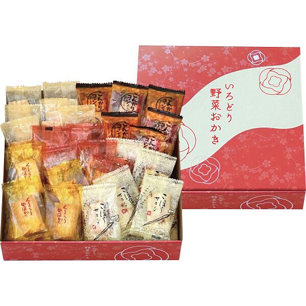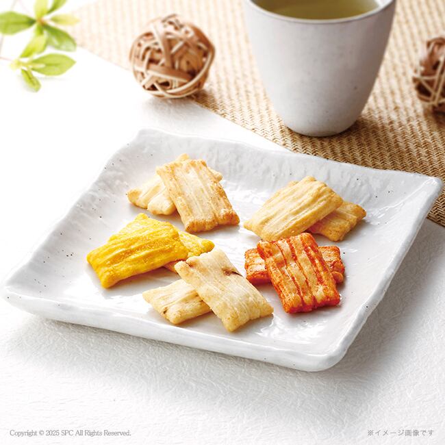 国産もち米を使用。5種類(とまと、じゃがいも、ごぼう、とうもろこし、かぼちゃ)のお野菜が入ったおかきを便利な個包装にして詰め合わせました。